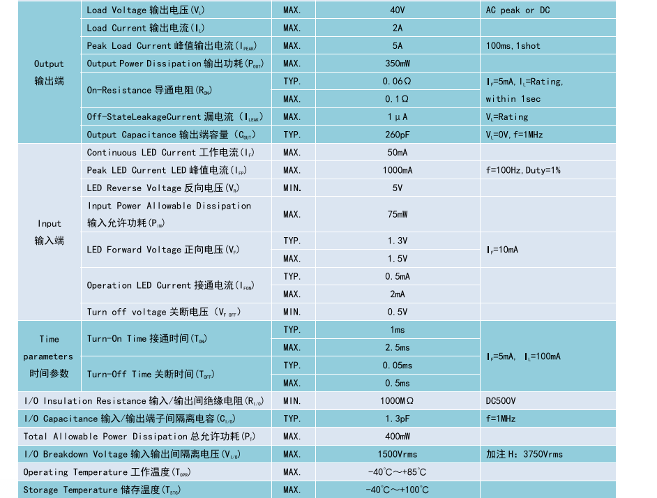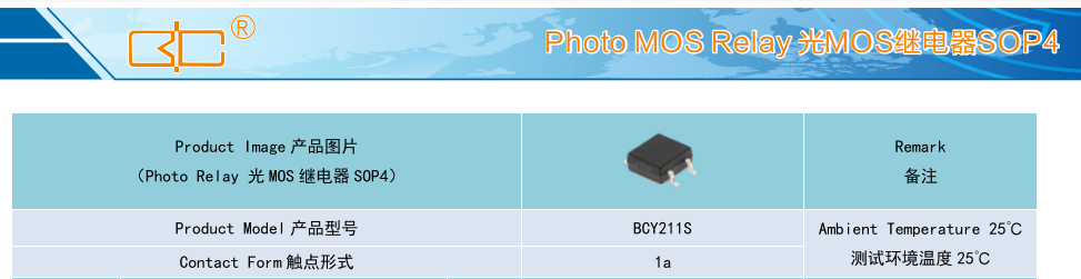 Relay 光MOS 繼電器 SOP4, Product Model產品型號:BCY211S, Contact Form觸點形式:1a, Ambient Temperature 25C, 測試環境溫度 25℃C